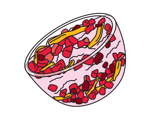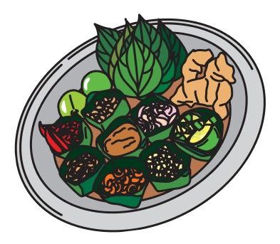 Miang Kham translates to 'many things in one bite', and it shows in how the dish is served: an array of ingredients in leaf-wrapped holders placed in a bamboo basket bowl. These include shallot, ginger, toasted coconut shreds, dried shrimp, lime and bird's eye chilli. To eat, a pick of each ingredient is assembled with the betel leaf rolled into a cone-wrap, and dipped in a sweet, savoury palm sugar dressing. Refreshing, yummy and fun to share! Get our Miang Kham recipe here.